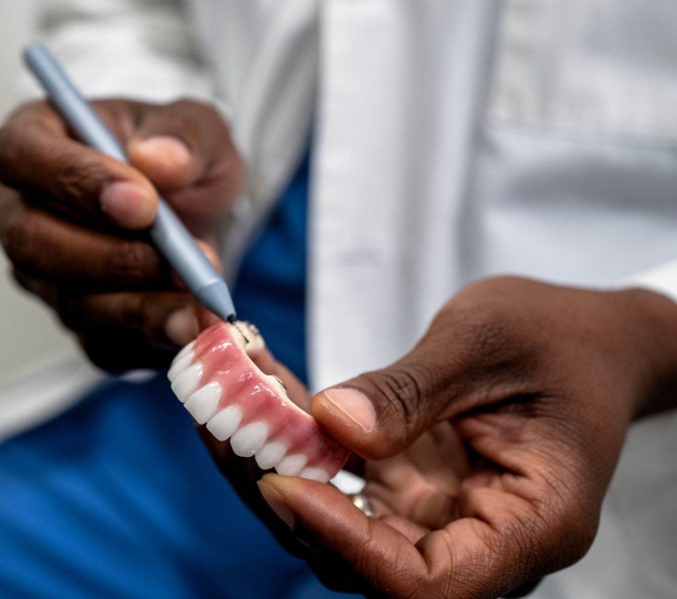 The full procedure is done in a single day. After the implants are placed, a temporary set of teeth is attached immediately, so you walk out with a full smile. A permanent, custom set is placed once healing is complete.