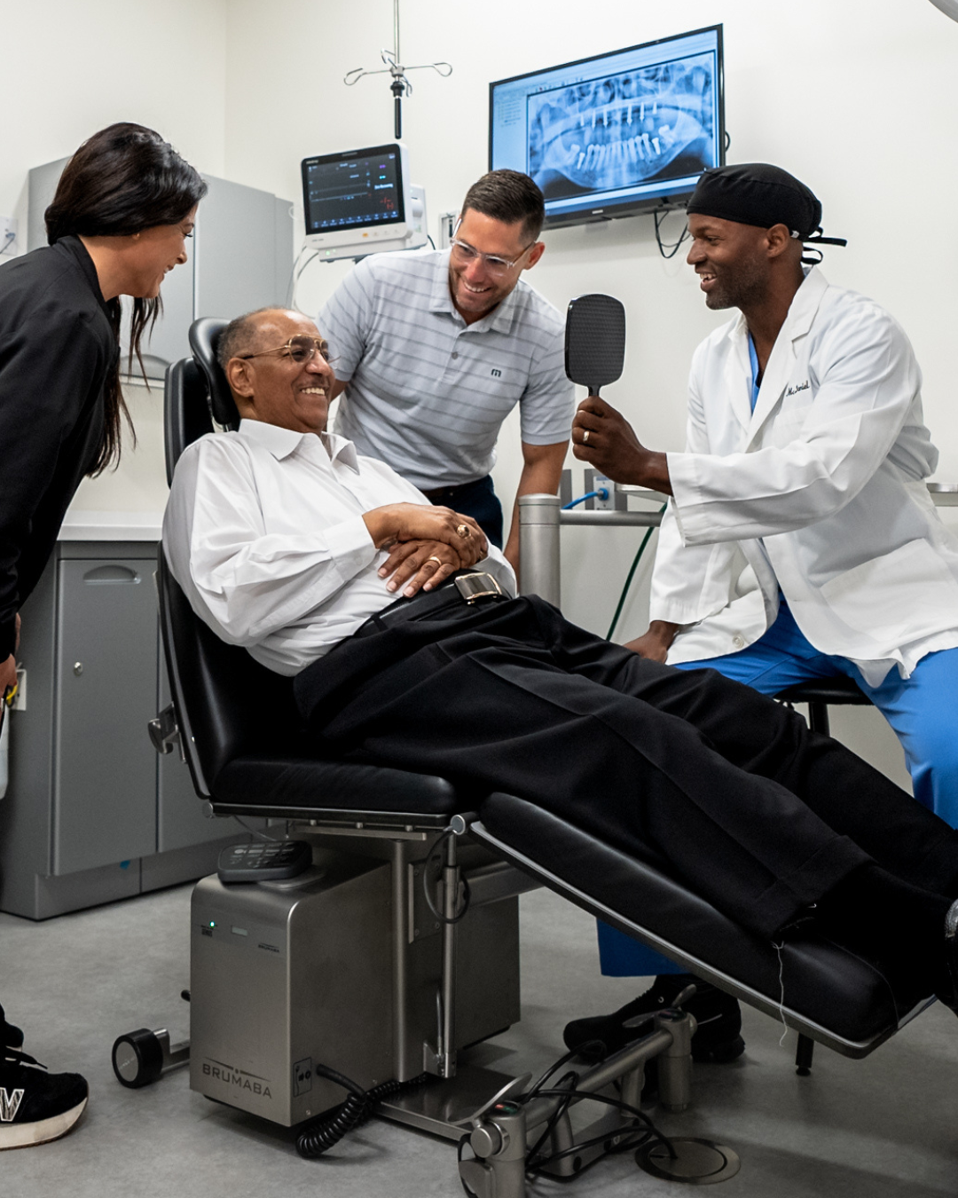 The full procedure is done in a single day. After the implants are placed, a temporary set of teeth is attached immediately, so you walk out with a full smile. A permanent, custom set is placed once healing is complete.